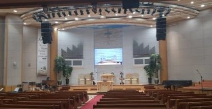 Lumens VC-A60S PTZ 摄像机安装在主教堂大厅,用于捕捉演讲者和观众,以进行现场制作和直播