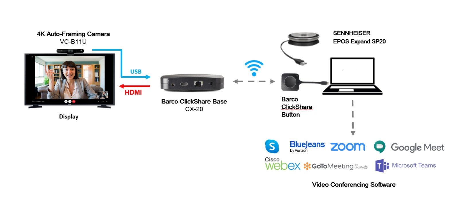 Barco Clickshare 可与您的笔记本电脑和各种视听外设无线连接。