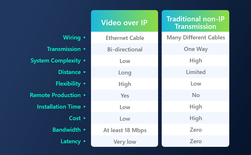 首先,基于IP的传输双向运行:所有信号都通过网络电缆路由。 单根Ethernet电缆可以提供视频、音频、控制信号并为设备供电(如果支持)。 一根 cat 5e 电缆可以替代视频电缆(HDMI 或 SDI)、音频电缆、理货线和电源线。 这有助于AV团队降低视频安装的成本、时间范围和管理开销。