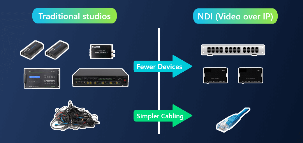 传统上,广播工作流程依赖于需要专用连接器和电缆的基带信号。 通常,HDMI、SDI和DVI用于视频内容,而XLR、RCA和TS用于流行的音频传输。 还有许多种用于控制和计数的电缆。 演播室、AV装置或会议室很容易被一堆电缆淹没。
