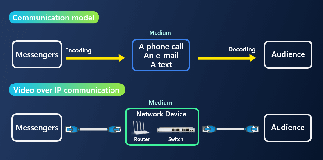 自然的人类交流是面对面的,即时的。 远距离通信需要中介员来启用消息交换,无论是电子邮件服务器、内容交付网络(CDN)还是 SMS 服务。 IP视频提供实时媒体传输(单向或双向),需要以高速编码器、解码器和交换机的形式进行中介,以及用于传输数据的低延迟通道。