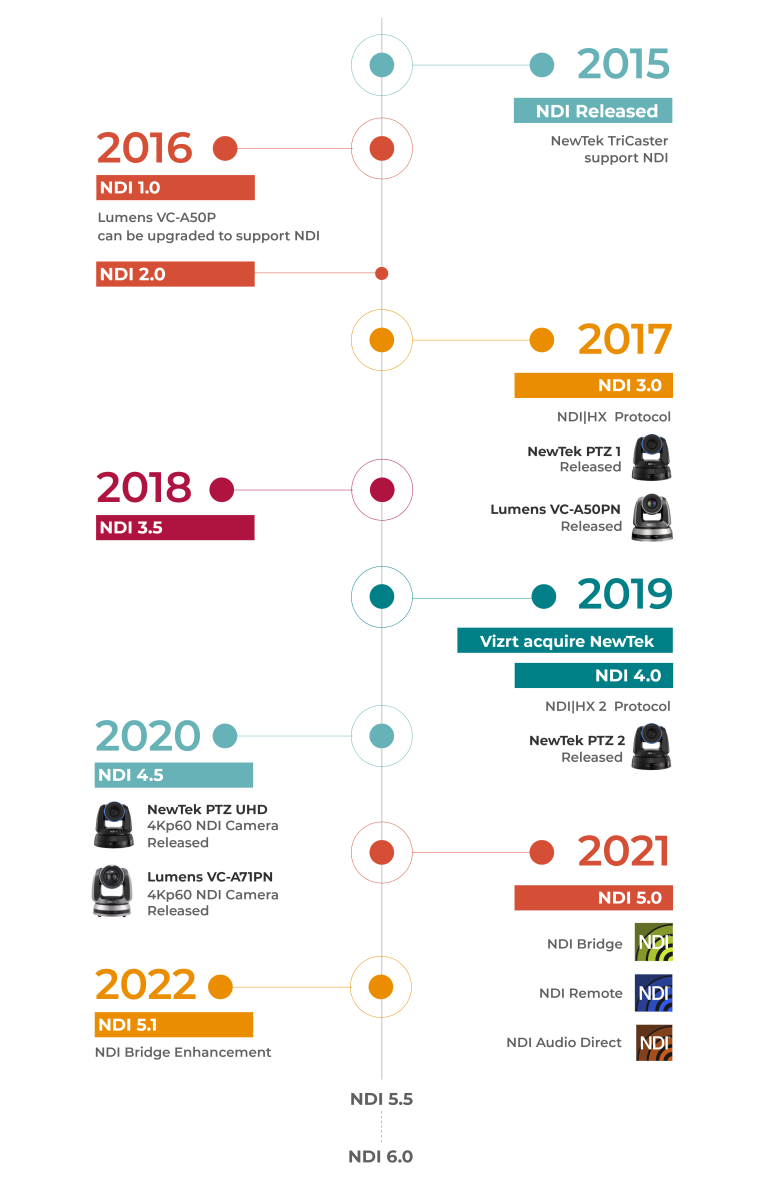 从2017年到2019年,许多第三方产品和服务开始支持 NDI,包括 Microsoft、Skype、Avid、EVS 和 OBS。 Vizrt 于2019年收购了 NewTek,同年又宣布了NDI ® 4.0,增加了多种 TCP 模式。 同年发布了采用 H.265 压缩的 NDI| HX2 协议。 2020年,NewTek 发布了全球首款NDI ® | HX UltraHD PTZ 摄像机,可生成 4K 60P NDI视频流。 后来,Lumens也宣布了VC-A71PN。