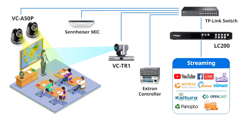 Lumens 课程录制和流媒体解决方案使KIIT等机构能够为学生提供世界一流的在线教学。 使用自动跟踪VC-TR1摄像机捕捉演示者,使用VC-A50P摄像机录制学生,以及Sennheiser吸顶式麦克风,该大学可以录制高质量和接近电视标准的讲座。 该系统的核心是Lumens LC200 CaptureVision Station和Extron控制处理器; 它们共同使通过实时流传输多摄像机视频内容变得简单。 无需视频操作器,并且具有易于使用的用户界面,该解决方案可节省机构的时间和金钱。