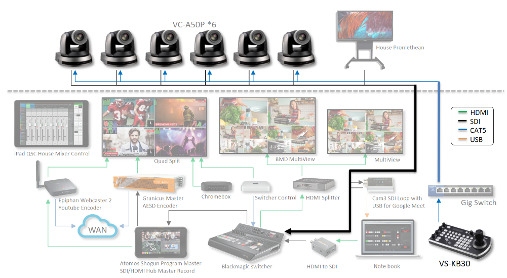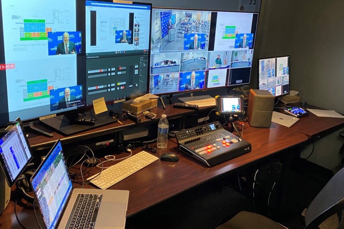 随着AESD开始过渡到现场面对面会议,需要一个混合解决方案,这就是 Lumens 发挥作用的地方。 经过仔细考虑并与当地的南加州供应商 VMI 和 Lumens 代表会面后,AESD购买了两台 Lumens VC-A50P摄像机,并将它们安装在 C-Stand 上,学校董事会遍布整个房间。 摄像机由房间角落的操作员使用 Lumens VS-KB30 控制器和 Blackmagic 切换台进行控制。