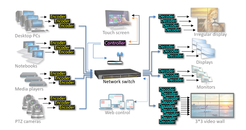 解码器和编码器使用标准的 1m-100m 电缆连接到网络交换机。 这意味着从原编码器到显示器解码器的最大传输距离可达200m。 使用标准 Ethernet 电缆能够以非常低的成本提供长距离传输。