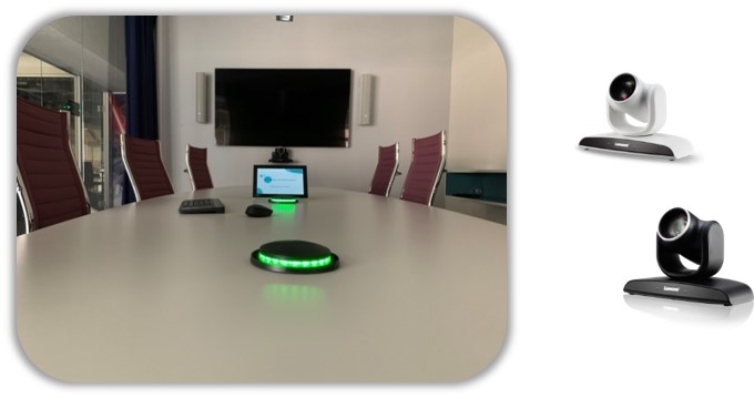•在会议室中,VC-B30U通过USB连接到迷你电脑,并运行视频会议软件。
