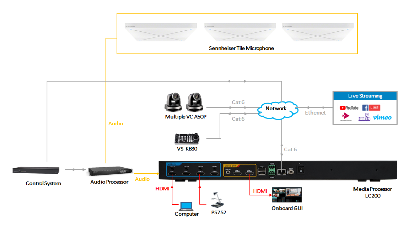 整合的最佳部分是“追踪”功能。 当 Sennheiser 吸顶式麦克风捕捉到主讲者的声音时,音频 DSP 将触发控制系统。 然后,控制器将命令摄像机对准正在演讲的人员。 整个连接全部在IP上,安装相当容易。