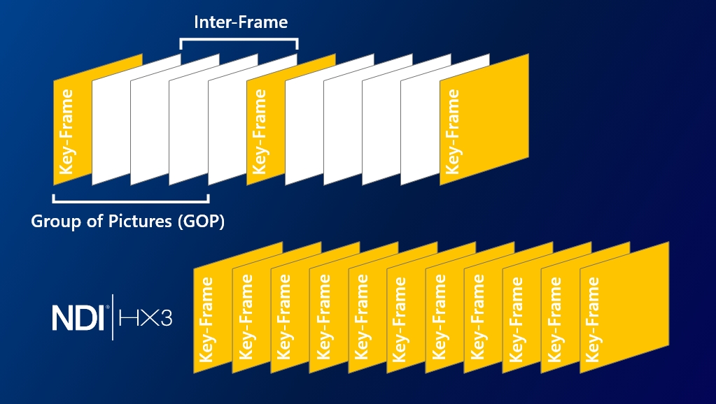 HX3 采用 GOP 技术来实现视频质量的这一步变化。 那么,什么是共和党? 压缩视频流由一系列连续的GOP(图片组)组成。 GOP 包含编码比特流中的关键帧和帧间帧。 关键帧(也称为 I 帧)具有图片的完整信息,描述帧的所有细节。 帧间(p 帧或 b 帧)仅描述图片中已更改的部分。 这就是压缩技术如何摆脱冗余信息并减少所需带宽的方式。 简而言之,更多的关键帧意味着更多的数据和更高的影像品质,而更多的帧间意味着更少的数据和轻微的视频质量损失。 除了提供更高的影像质量外,关键帧需要的计算处理更少,因此帧间越少,延迟就越低。